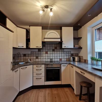 1 Küche ( 4-Plattenherd mit Ceran-Kochfeld, Dunstabzug, Backofen, Spülmaschine, großer Kühlschrank mit Gefrierfach, Kaffeevollautomat, Wasserkocher, Toaster, Eierkocher, ausreichend Geschirr)